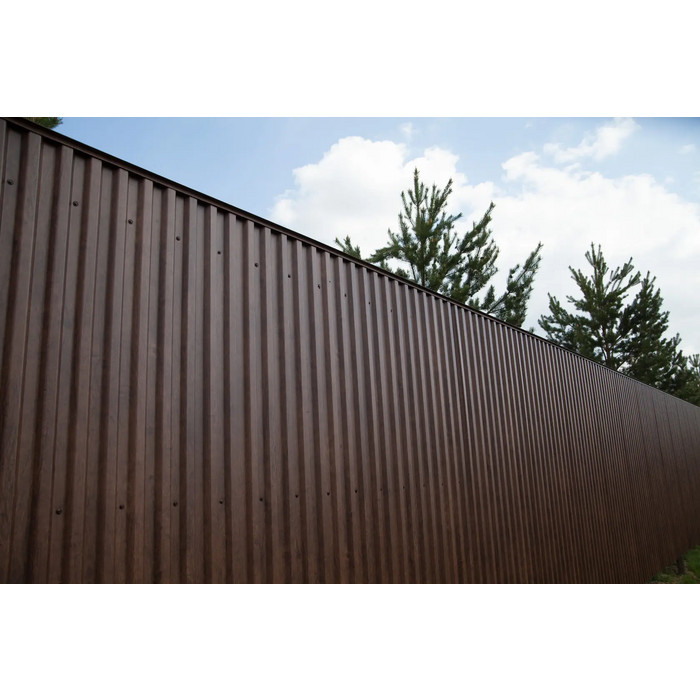 Цвет профлиста - RAL 8017 Коричневый шоколад, который придает ему элегантный и стильный вид. Этот цвет отлично сочетается с различными фасадами и создает гармоничный образ.
